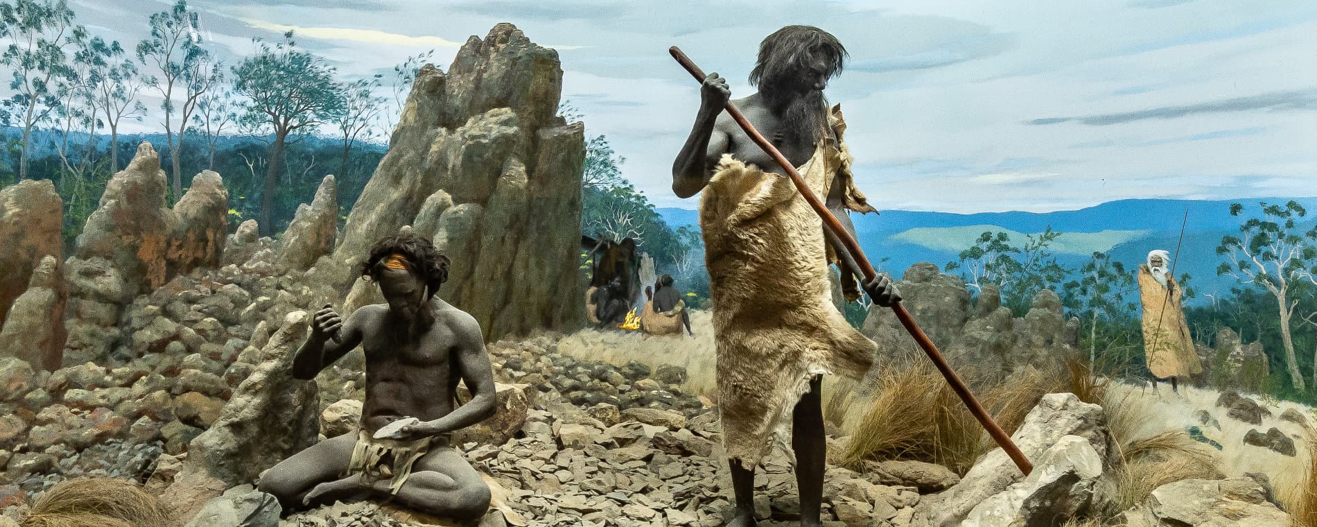 The figures are copies of the Museum of Victoria 19th century life casts made from members of the Yarra tribe of Melbourne. The dioramas were the work of Victorian artist George Browning (1918-2000), a graduate of the National Gallery of Victoria School and RMIT.